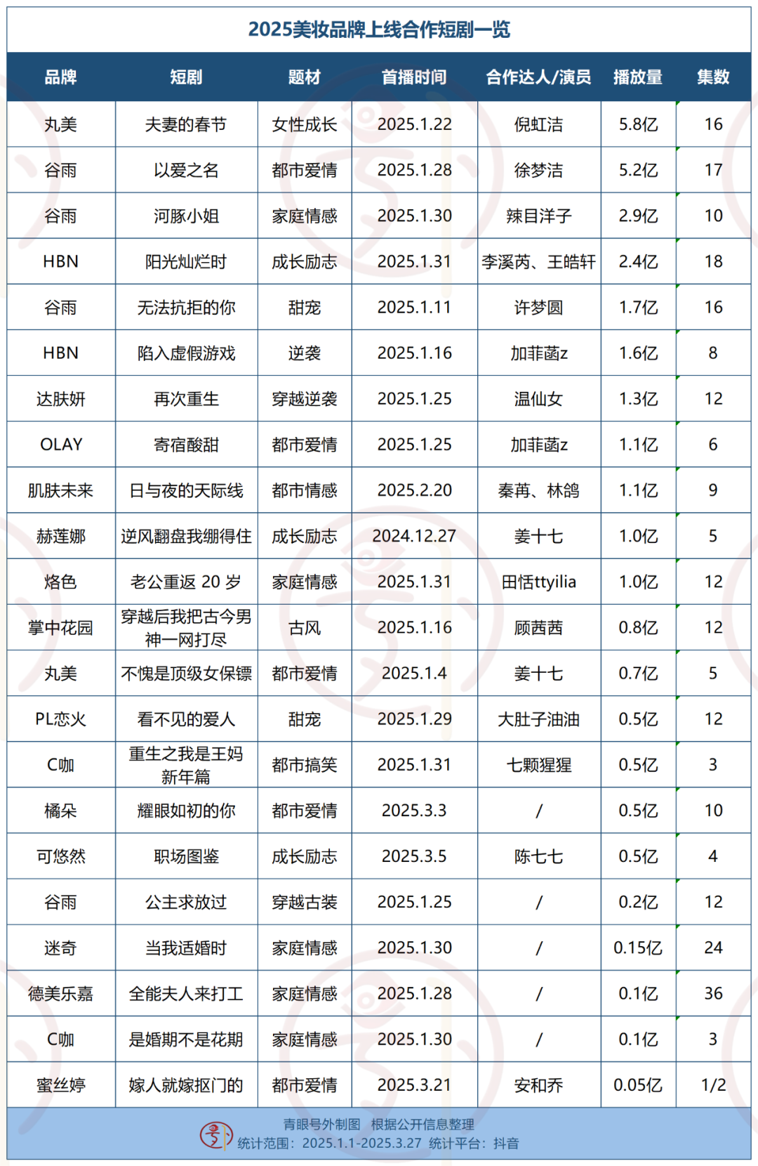 青眼号外梳理发现,2025年以来至少有22部美妆品牌合作短剧上线,其中11部短剧播放量破亿。而据DataEye发布的《2024年微短剧行业白皮书》,过去一年抖音上线短剧超2万部,近半数播放量在100万以下,破亿和破5亿的短剧分别仅占4.3%和0.2%。