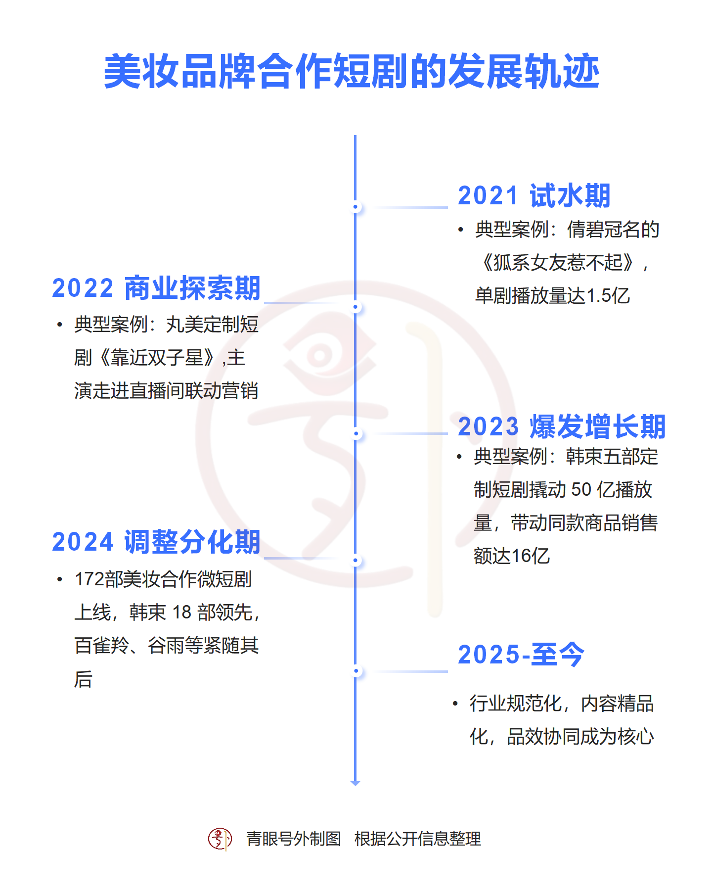 青眼号外梳理了“美妆+短剧”营销发展轨迹发现,早在2021年底,就已有美妆品牌开始涉足微短剧领域。如倩碧冠名的《狐系女友惹不起》在快手获1.5亿播放量,但呈现形式仍是传统的“贴片”广告。
