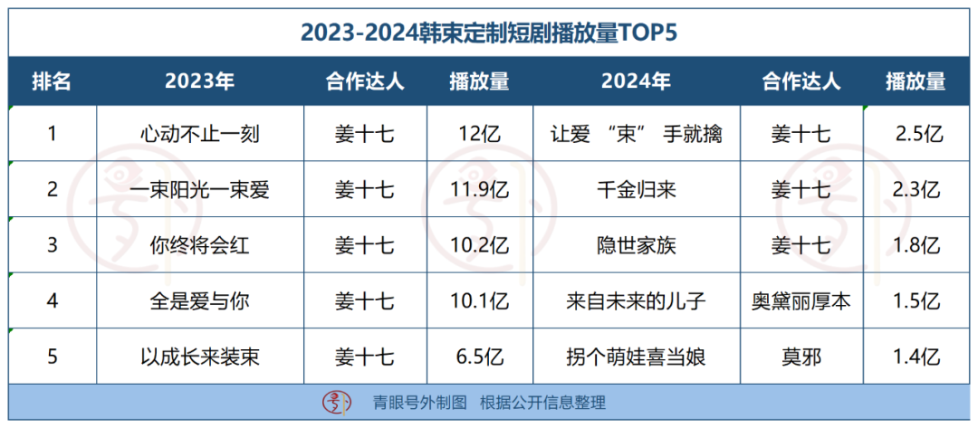 不过,相比于2023年的爆发式增长,2024年韩束定制短剧曝光量开始快速缩水。青眼号外统计了韩束近两年播放TOP5短剧播放量发现,总播放量同比下滑了80%左右。