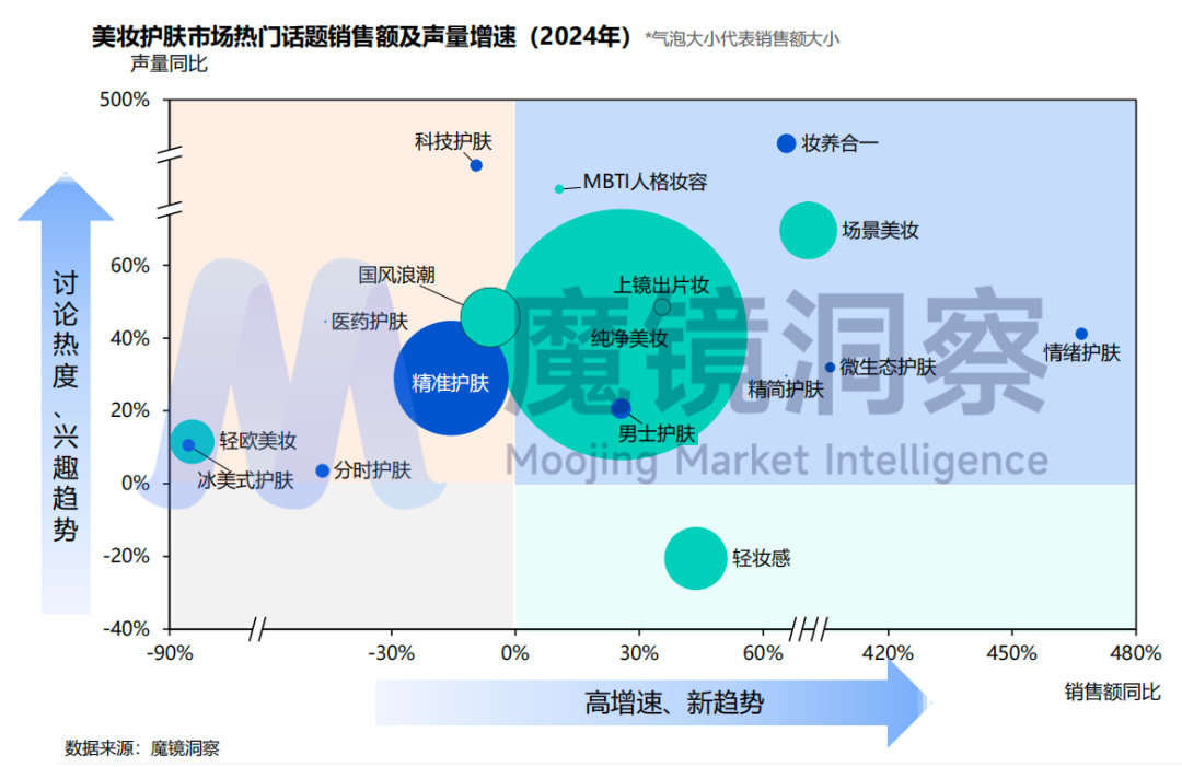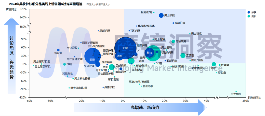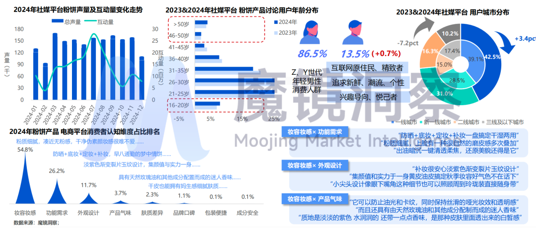 在彩妆市场中,粉饼细分品类的表现尤为出色,国货品牌凭借其高性价比和肤质专研迅速崛起;消费者年龄两极化发展趋势,情绪疗愈功效成为讨论热点。