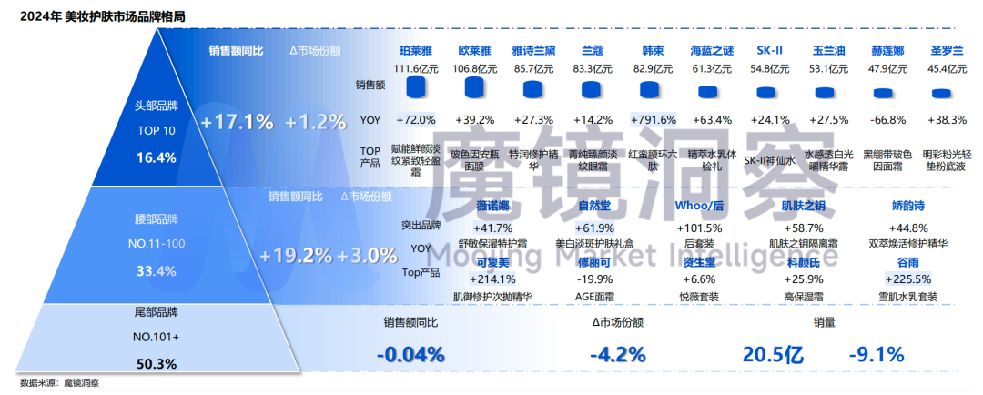 其二,2024年美妆护肤行业市场继续向头部、腰部品牌集中。