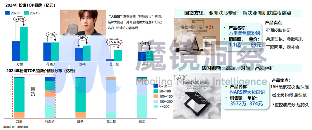2024年粉饼头部品牌增势强劲。方里品牌脱颖而出成为市场的主导力量。方里价格主要集中在50-100元,其粉状细腻度与持妆效果对标高端产品,凭借其高性价比吸引学生党及预算敏感用户。