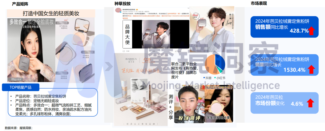 芭贝拉品牌的增速也尤为亮眼,其同比增长率高达537%。芭贝拉粉饼系列精准定位“轻质彩妆赛道”,并携手品牌大使赵一博,通过站内站外的全方位内容布局,成功吸引了广泛的市场关注和认可。