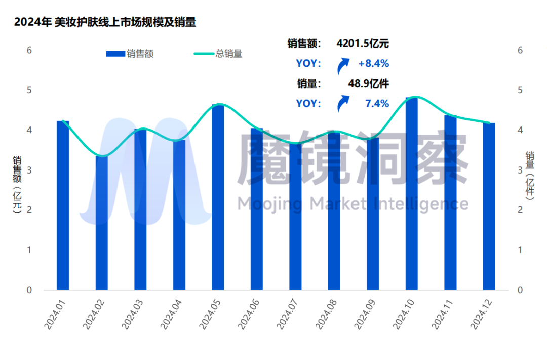 随着颜值经济和悦己潮流的持续盛行,美妆护肤市场迎来消费热潮。魔镜洞察数据显示,美妆护肤市场2024年线上销售额4201.5亿元,同比微增8.4%,销量48.9亿件,同比增加7.4%。