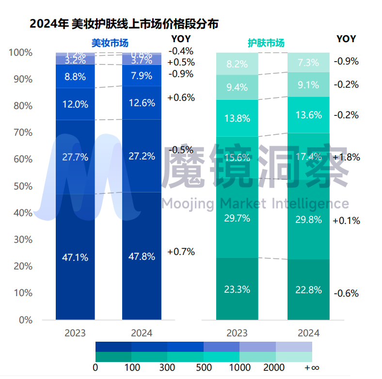 数据显示,彩妆赛道低价格段市场规模占比增长0.7%;护肤消费者也开始更加注重产品的实用性和性价比,300-500元价格段市场规模占比增长1.8%,500元以上价格段普遍面临销售下滑。