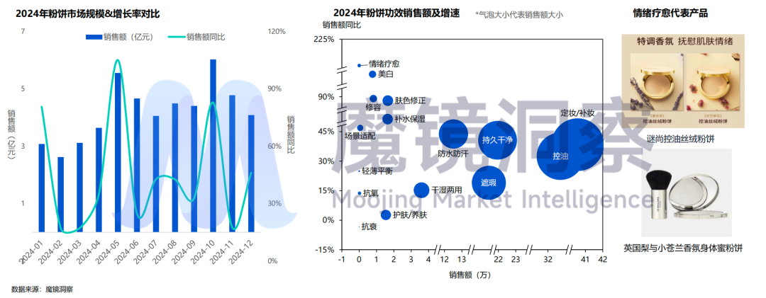 总体看,2024年粉饼市场销售额50.5亿,实现了43.5%的显著增长。情绪疗愈、美白、修容为高增关键词,满足了消费者对于高效、多功能美妆产品的需求。随着消费者对情绪价值的需求激增,美妆产品从单纯功能导向转向“感官体验+情绪干预”的复合设计逐渐渗透到粉饼类目。情绪疗愈类产品的销售额同比更是达到了211.6%,显示出这一新兴领域的巨大潜力和市场接受度。