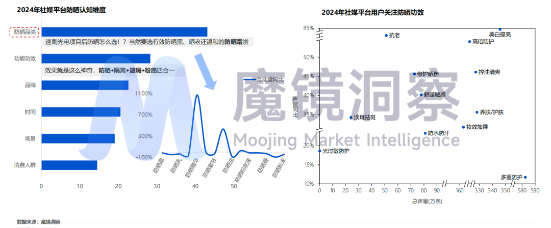 随着消费者防晒意识的提升,防晒产品在社媒平台上受到广泛的关注。2024年消费者对防晒品的认知维度主要集中在防晒品类和功能功效维度。其中防晒精华互动量同比增加最高,根据消费者评论,用户的需求不仅满足防晒黑,同时兼顾抗老、温和等功效。多重防护成为消费者讨论的热点。防晒+美白提亮、防晒+抗老功效展现强劲的发展势头。