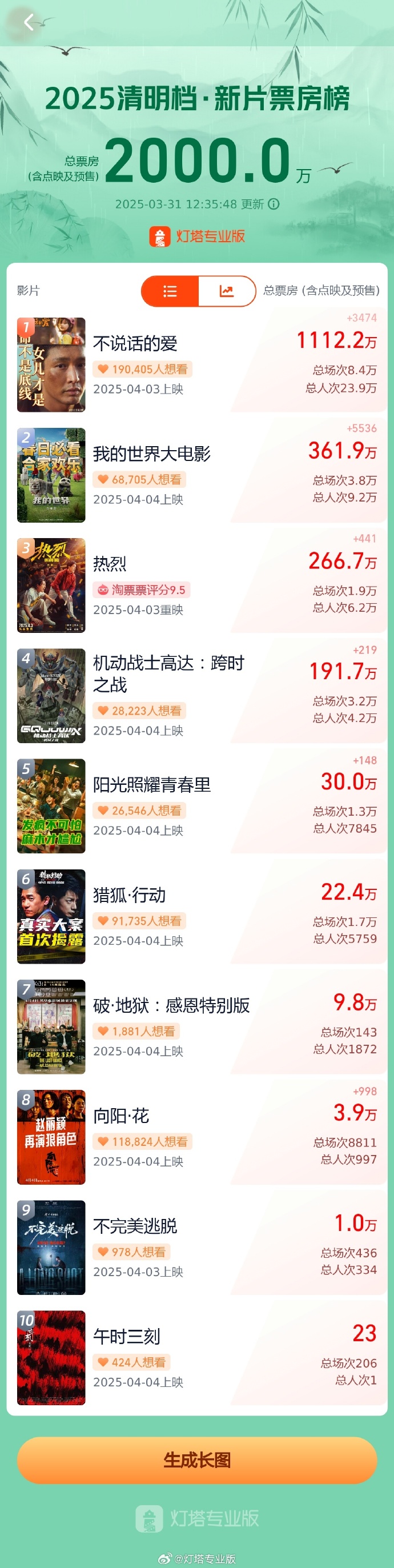 据灯塔专业版,截至3月31日12时35分,2025年清明档10部新片(含重映)预售总票房(含点映)突破2000万元。