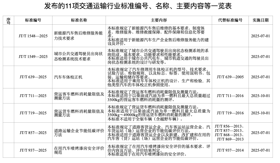 交通运输部发布《新能源汽车售后维修服务能力技术要求》等11项交通运输行业标准: