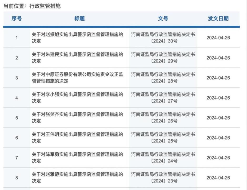 2024年4月,河南证监局一次性对中原证券开出8张行政监管措施决定书,指出中原证券存在合规风控缺位,违规开展股票质押业务、债券销售业务,公司员工兼职管理、廉洁管理不到位等5大问题。