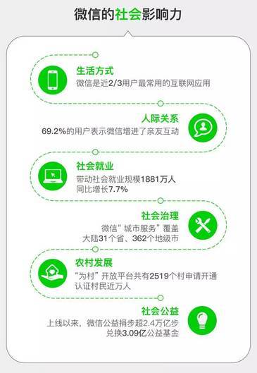 据《2016年微信社会经济影响力研究》报告显示:2016年,微信拉动全社会消费4475亿元,同比增长37.6%,其中带动就业规模达1881万人,同比增长7.7%,其中直接就业466万人,间接就业1415万人。