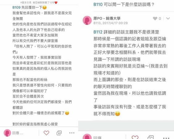 炎亚纶今日在脸书贴出网友发文截图,对方自称是他的粉丝,并爆料炎亚纶曾在访谈中承认性向,“他的性向是他在我们访谈过程中,在经纪人及他本人的允许下他自己坦承的。”不过因希望大家别多加揣测,所以交代他们不要大肆宣扬,并表示炎亚纶当时说:“但有人问了,可以心平气和地告诉他”,刚好有人发问,他便如实回答。另外,该网友表示这是以前在一位认识的记者姐姐带领下,参与过炎亚纶担任来宾的访谈现场,以上的内容则是访谈结束后聊到的。