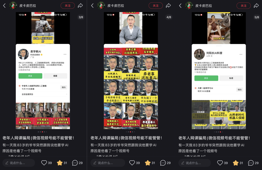 一位广东的网友表示,他翻看了父亲关注的视频号,发现了好几个账号,他们普遍都打着“985博士毕业”、“多家AI公司创始人”这样的标签,以教老人如何使用养老机器人,或者用AI制作短视频赚钱等理由,向老年人卖课。