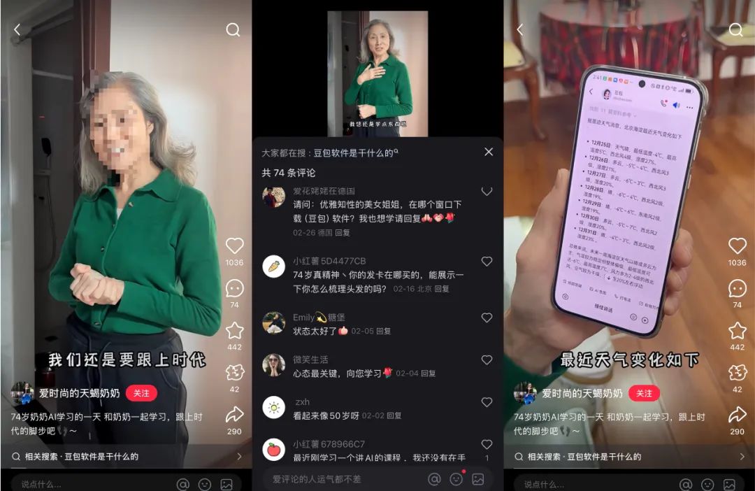 我们发现,视频平台上存在越来越多老年人拍摄的视频。这些视频中,阿姨们青春活力,容光焕发,她们和观众分享自己每天学习AI的心得体会。