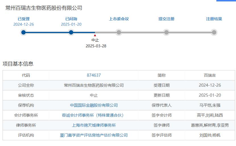 2024年12月26日,百瑞吉向北交所递交招股说明书并获受理。然而进入2025年后,百瑞吉在北交所的上市进程按下了暂停键。据北交所官网披露,2025年3月28日,百瑞吉因财务报告到期补充审计事项申请中止审核根据《北京证券交易所向不特定合格投资者公开发行股票并上市审核规则》第五十二条,北交所中止其公开发行股票并上市审核。