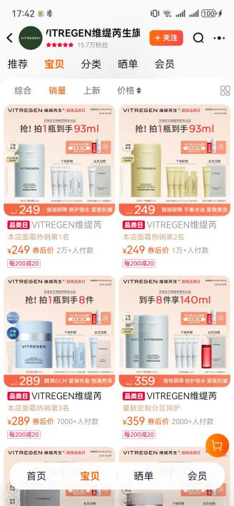 其中,维缇芮生屏障强韧/平衡面霜为品牌的主打产品,在2024年,该产品单个链接GMV在1000万-2500万之间,此外还有3款面霜链接GMV在500万-750万之间。另据天猫维缇芮生旗舰店显示,维缇芮生屏障强韧/平衡面霜也分别有超2万人、1万人付款,为该店铺销量最高的两款产品。可见,维缇芮生主打产品在天猫也有着不错的表现。