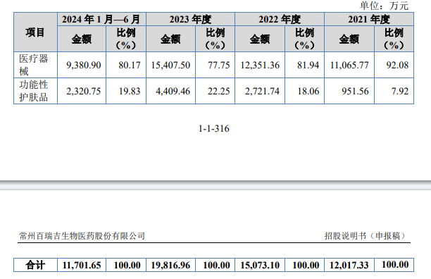 相较于医疗器械业务,百瑞吉功能性护肤品业务占比并不大。据招股书显示,百瑞吉2021年-2024年上半年功能性护肤品收入分别为951.56 万元、2721.74 万元、4409.46万元和2320.75万元,占比分别为7.92%、18.06%、22.25%和 19.83%。百瑞吉在招股书中表示,“报告期内,公司功能性护肤品收入增长较快主要系公司于2021年开始发展功能性护肤品的电商业务所致。”