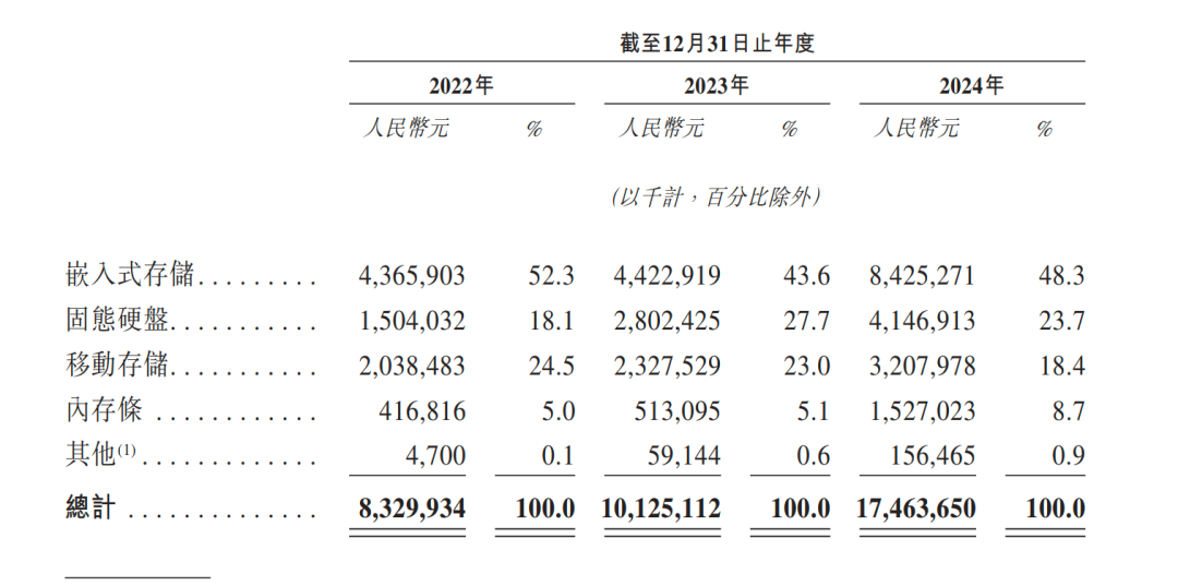 《招股书》显示,公司将业务分为嵌入式存储、固态硬盘(SSD)、移动存储(存储卡、U盘等)和内存条。嵌入式存储用于设备内的内置存储芯片;固态硬盘主要用于高速存储需求;移动存储可便捷携带;内存条用于临时存储数据,类似大脑的即时记忆区。