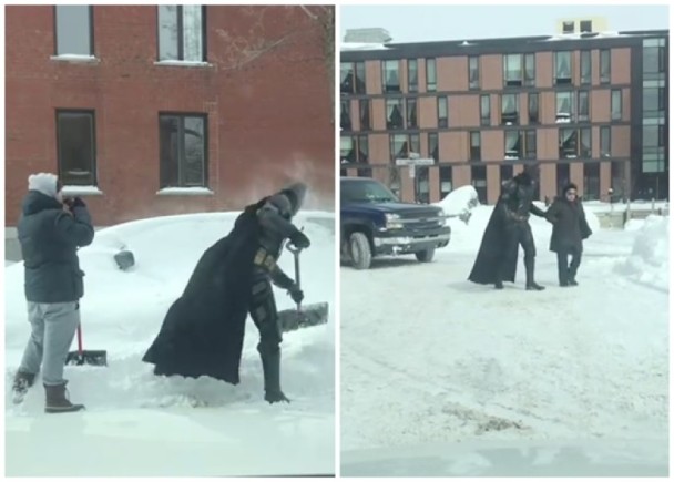 真人蝙蝠侠最早出现在加拿大是在3月,位于魁北克省的东部城市蒙特利尔,当时蒙特利尔大雪纷飞积雪厚达40厘米,不少车主要花不少工夫除雪,才能开动汽车。正当所有人都对如何挪车一筹莫展的时候,竟然出现了一位蝙蝠侠拿着铁铲来帮忙。
