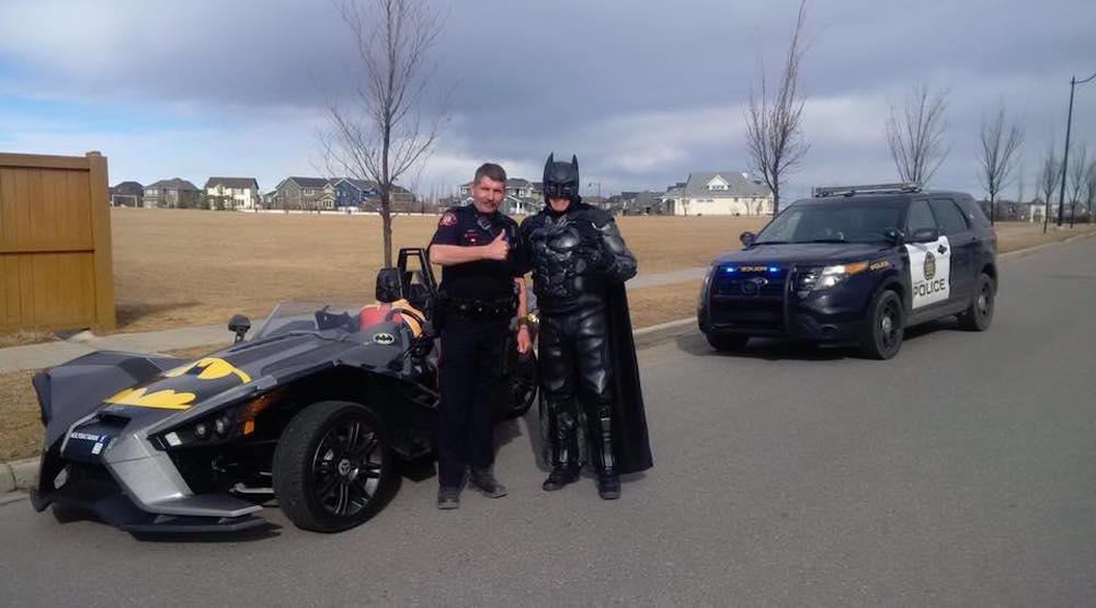 而到了4月中旬,加拿大阿尔伯塔省的中部城市卡尔加里同样出现了蝙蝠侠的身影。而这次蝙蝠侠的情况可不同于上面两位,他在道路旁被警察查车。或许由于坐骑太拉风,或许是着装太前卫,这位蝙蝠侠和他的超级跑车被当地警方给拦在了大街上。一问得知,原来,阿尔伯塔省卡尔加里警方(CPS)在大街上发现一辆几乎只有在电影中才能看到的酷炫蝙蝠侠跑车,司机竟然是一位“蝙蝠侠”。考虑到安全因素,交警便将其拦停。