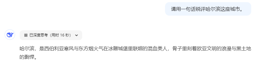 当人工智能的算法触角伸向哈尔滨这座冰雪王国,DeepSeek竟给出了令人拍案叫绝的赛博诗评:“哈尔滨,是西伯利亚寒风与东方烟火气在冰雕城堡里联姻的混血美人,骨子里刻着欧亚文明的浪漫与黑土地的剽悍。”