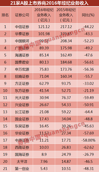 据券商中国统计,截至4月16日,已有21家A股上市券商发布2016年年报,受交易量萎缩和佣金费率下降等因素影响,9家上市券商经纪业务收入同比下降逾五成。
