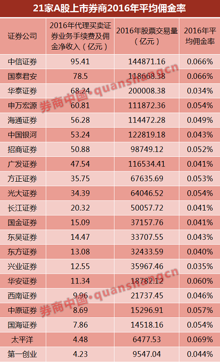 以上市券商为例,从2016年“代理买卖证券业务手续费及佣金净收入”指标来看,共7家A股上市券商去年全年代理买卖证券业务收入超过50亿元。中信证券位居行业第一,达95.41亿元,去年全年股基交易总额14.49万亿元,平均佣金费率万分之6.6;