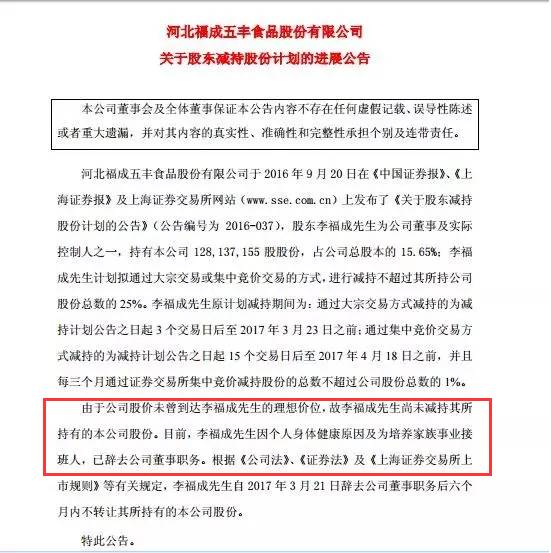 2016年9月20日,李福成曾抛出减持计划,其以个人资金需求为由,拟通过大宗交易或集中竞价交易的方式减持持有的福成股份,减持数量不超过其所持公司股份总数的25%。当时李福成持有公司1.28亿股股份,占公司总股本的15.65%。以此估算,李福成此番至多可减持3200万股,套现约4.55亿元(以当时市价测算)。