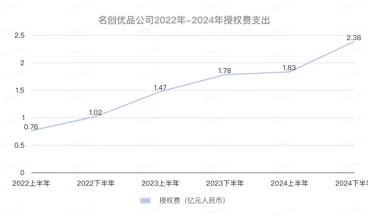 根据名创优品财报,从2022年至2024年,名创优品公司在授权费用支出方面成本持续增加。2022年支出1.78亿元,2023年支出3.25亿元,2024年支出4.21亿元。与2023年相比,2024年名创优品公司在授权费用支出方面的成本同比增长29.5%。其中也包含了“名创优品”品牌在IP授权方面的支出费用。