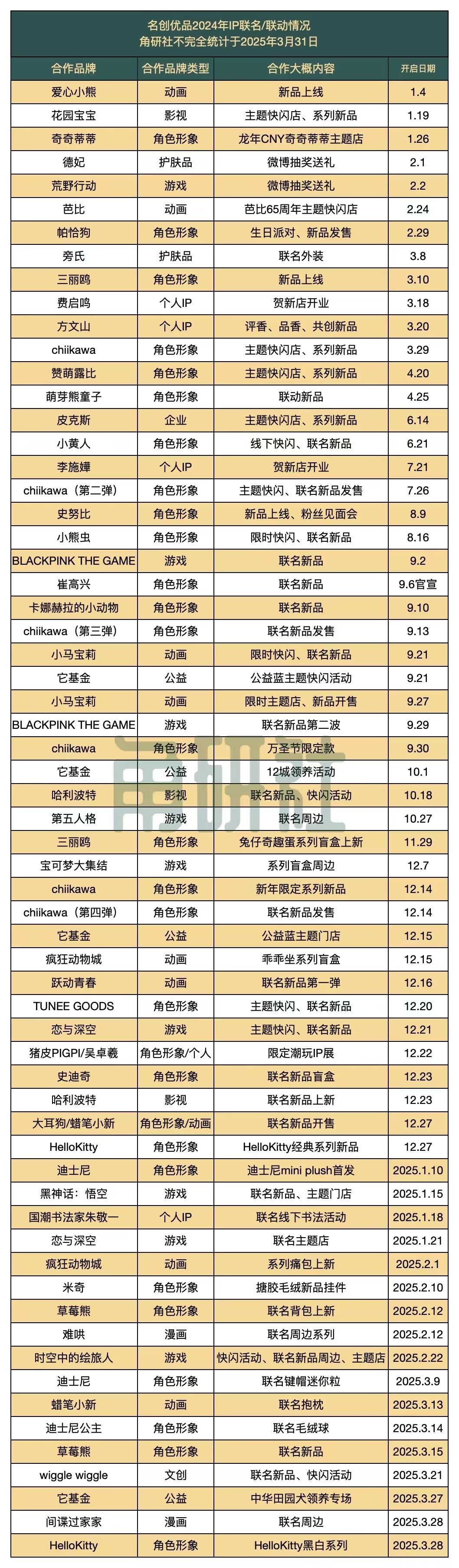 持续增长的IP授权成本,都给了哪些IP?带着这个问题,角研社整理了2024年至今,“名创优品”品牌的IP联名合作信息。