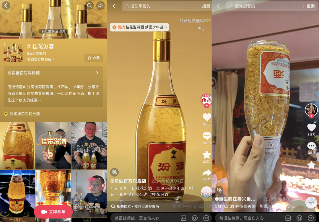 无独有偶,社交平台上出圈的桂花汾酒同样是一位有段位的“情感大师”。2024年10月,抖音账号“汾酒旗舰店”发布的桂花汾酒自调酒视频在网络上迅速走红,抖音平台播放量超过3.6亿。以此为始,抖音、小红书、B站等平台掀起了一阵“桂花汾酒怎么泡好喝”“解锁汾酒新玩法”的全网热潮。