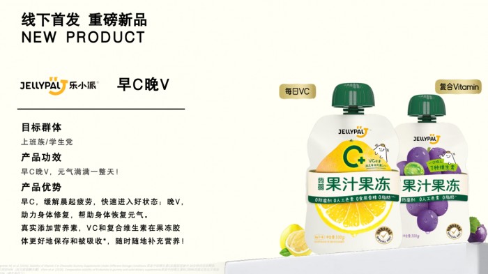 “早C晚V”是乐小派基于消费者对于功效性产品的需要,并结合零食的消费场景与消费者的消费心态所提出的全新健康概念,其核心倡导早晨补充维生素C,晚上摄入复合维生素,帮助年轻人建立更科学的营养节奏。其背后的原因则来自于早上补充维生素C,可以缓解晨起疲劳,快速进入好状态; 晚上补充复合维生素,可以调节细胞修复,帮助身体恢复元气。同时,维生素C和复合维生素在果冻胶体中可以更好地得到保存和吸收,果冻这种“零食化营养补充剂”的新形态与“早C晚V”这一概念天然适配,乐小派也希望以自身全新产品,能够帮助大家随时随地补充营养!