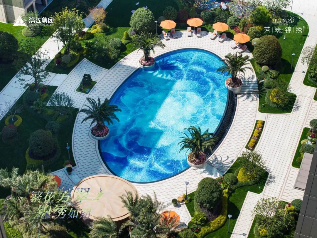 蓝宝石的波光,在翠绿掩映中闪耀光芒。艺术性的马赛克拼花铺装,与周遭环绕的绿意相辅相成;湛蓝与翠绿的交相呼应,给予了生活别样的度假风情。