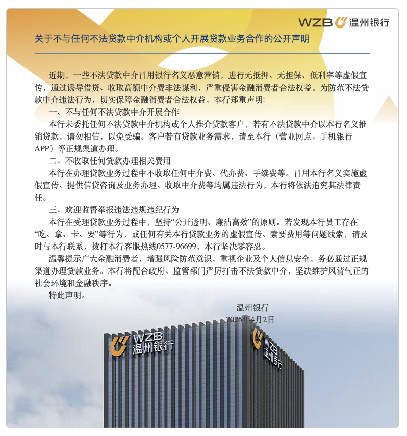 4月2日,温州银行发布声明称,近期,一些不法贷款中介冒用银行名义恶意营销,进行无抵押、无担保、低利率等虚假宣传,通过诱导借贷、收取高额中介费非法谋利,严重侵害金融消费者合法权益。为防范不法贷款中介违法行为,切实保障金融消费者合法权益,本行郑重声明: