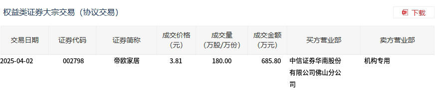 帝欧家居今日大宗交易平价成交180万股,成交额685.8万元