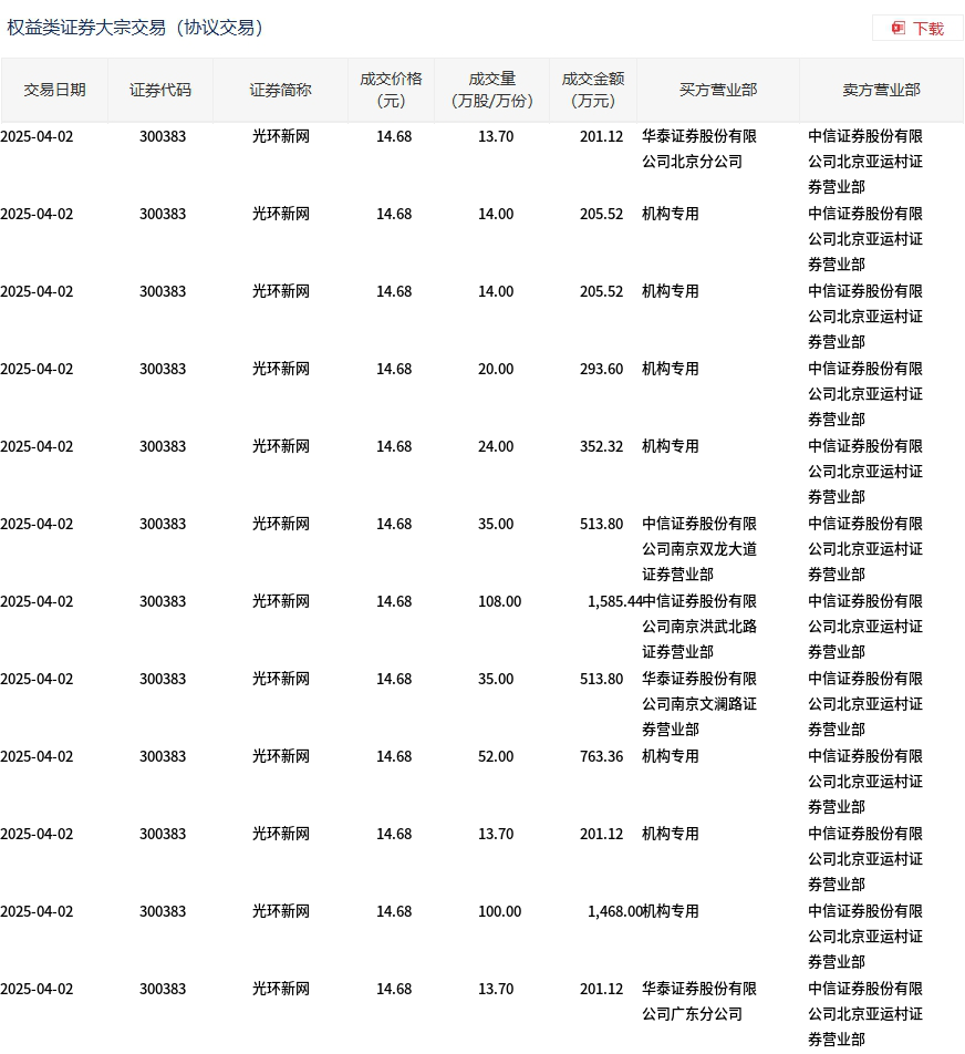 4月2日,光环新网大宗交易成交443.1万股,成交额6504.72万元,占当日总成交额的8.38%,成交价14.68元,较市场收盘价16.51元折价11.08%。