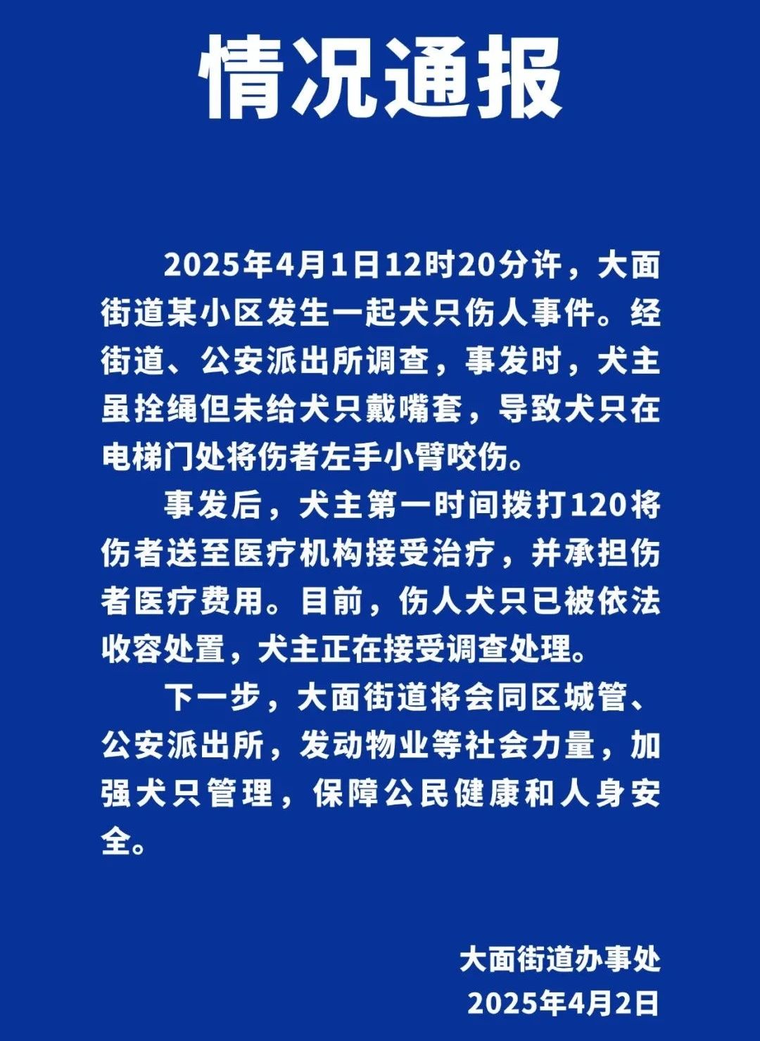 成都龙泉驿区大面街道办事处4月2日晚通报,4月1日12时20分许,大面街道某小区发生一起犬只伤人事件。经街道、公安派出所调查,事发时,犬主虽拴绳但未给犬只戴嘴套,导致犬只在电梯门处将伤者左手小臂咬伤。事发后,犬主第一时间拨打120将伤者送至医疗机构接受治疗,并承担伤者医疗费用。目前,伤人犬只已被依法收容处置,犬主正在接受调查处理。