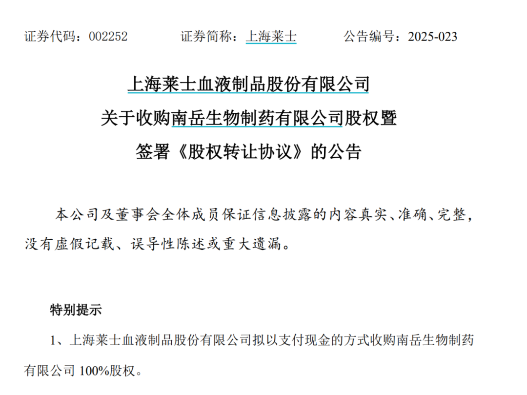 3月26日晚间,上海莱士发布公告称,拟以现金方式收购南岳生物100%股权。南岳生物是湖南省唯一拥有GMP证照的血液制品生产企业。