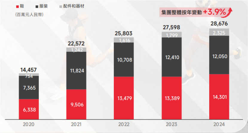 数据显示,2024年,李宁篮球类产品零售流水同比下降21%,而跑步类产品上升25%;与此同时,集团鞋类收入同比增长6.8%至143亿元,总营收增长3.9%至286.76亿元。