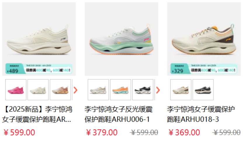 但其新品关注与讨论度有限,如#李宁惊鸿在小红书上相关话题仅有三条,最高话题浏览不超过2百万,最高讨论仅在3千左右;在电商平台销售榜单上,尤其双11、618等电商狂欢节点,李宁女子健身相关鞋类与服饰也少有上榜。