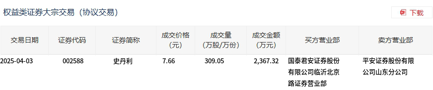 4月3日,史丹利大宗交易成交309.05万股,成交额2367.32万元,占当日总成交额的17.75%,成交价7.66元,较市场收盘价7.51元溢价2%。