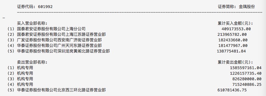 根据交易公开信息,华泰证券北京西三环北路证券营业部在4月17日当天共卖出15.5亿元雄安概念股。其中,卖出6.1亿元金隅股份(601992.SH),卖出6.07亿元京汉股份(000615.SZ),卖出3.4亿元冀东水泥(000401.SZ)。