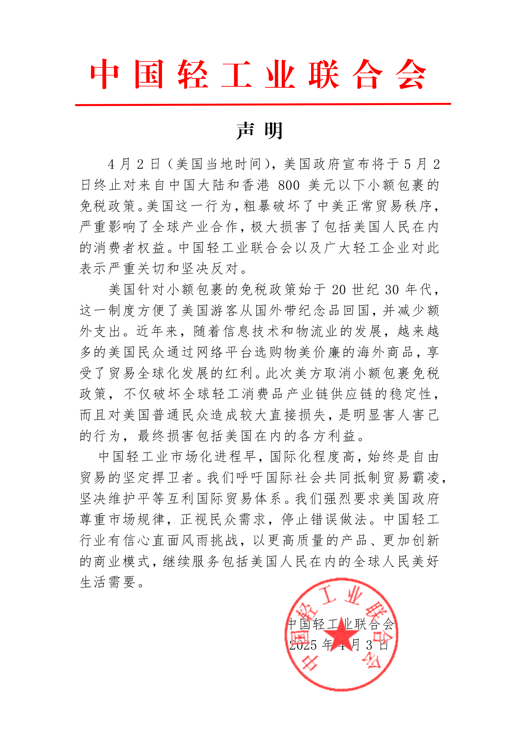4月3日,中国轻工业联合会发布声明: