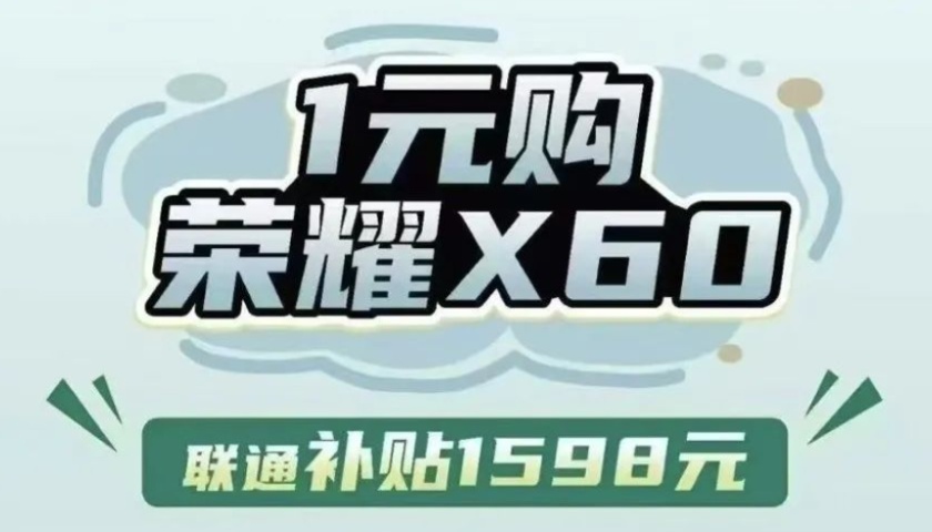 活动期间,消费者办理联通5G宽带套餐且符合相关条件,就能以1元的价格领取原价1599元的荣耀X60手机(12 + 256G)。