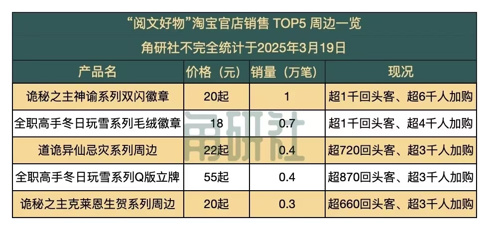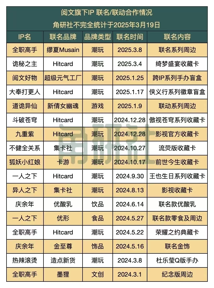 根据角研社不完全整理,在2024年至2025年3月期间,阅文旗下IP至少开展了17起含衍生品/消费品的联名合作。