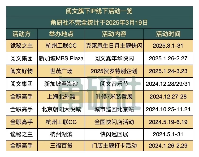 除了旗下IP与衍生品与消费品牌的联名联动合作。阅文也在通过线下主题活动的形式,来为系列新作增加品牌曝光和粉丝互动。