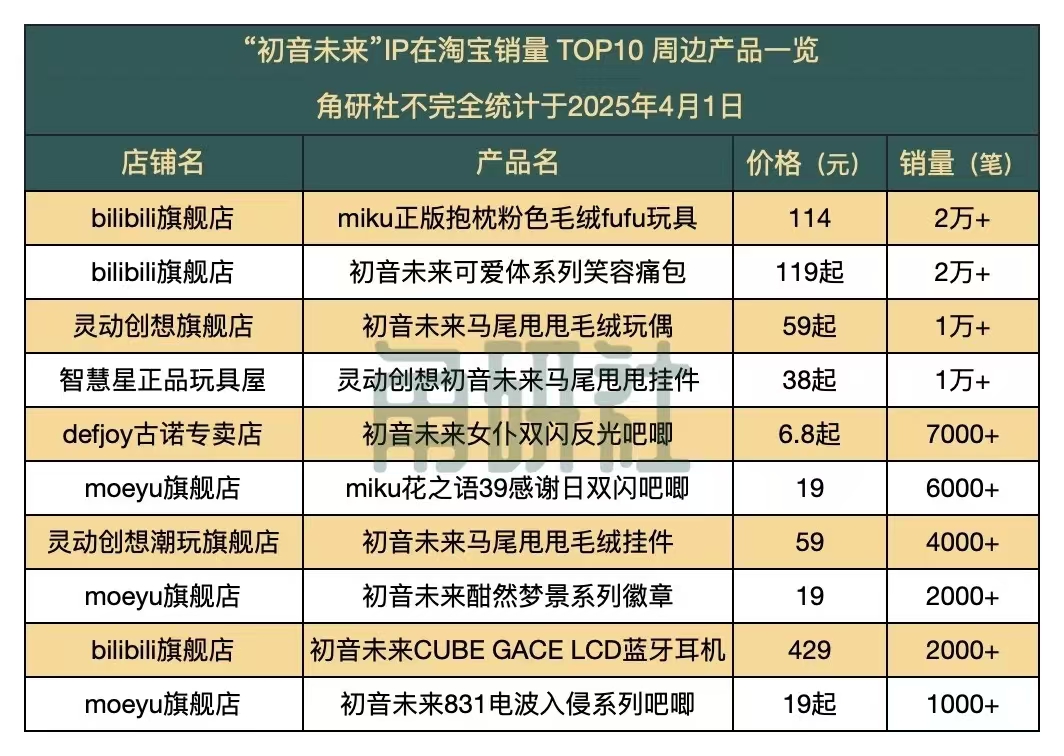 在国内,初音未来的官方衍生品,也有非常可观的销量。根据B站会员购数据,初音未来fuwa petit毛绒玩偶在2023年单品年销量就超过了30万件。在淘宝平台,bilibili旗舰店贩卖的“初音未来”IP款毛绒玩具、痛包,单款产品的月销量都也在2万单以上,灵动创想旗舰店的“初音未来”IP款「马尾甩甩毛绒玩偶」,也卖了超1万单。