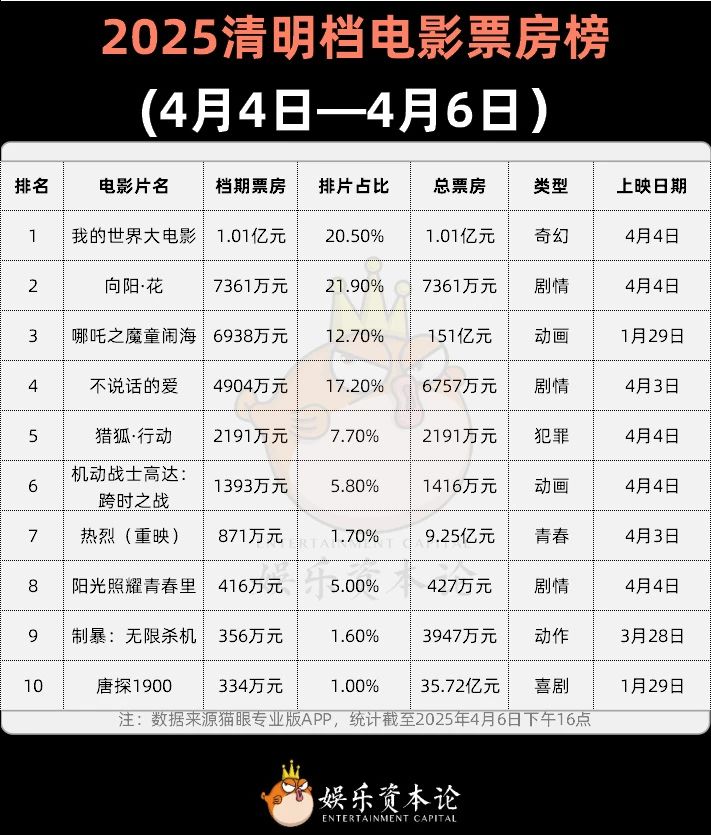 他强调,历年的3月和4月都是影院的传统淡季,今年的3月比往年还要冷一些,3月份影院主要靠《哪吒2》吸引观众,其余新片卖不动。放眼市场大盘,3月新片甚至没有突破1亿元的票房成绩。清明档的《向阳·花》《我的世界大电影》《不说话的爱》等新片卖座,终于打破这个僵局,给影院带来一线生机。