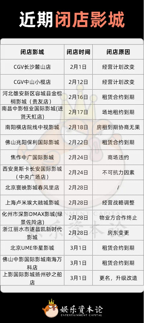 据娱乐资本论统计,就在2月末3月初的半个月内,至少有15家影院公开发布了闭店通知。大部分影城的闭店原因是租赁合约到期,CGV、卢米埃两家则是经营计划调整,很明显地在有规划地退出一些市场。