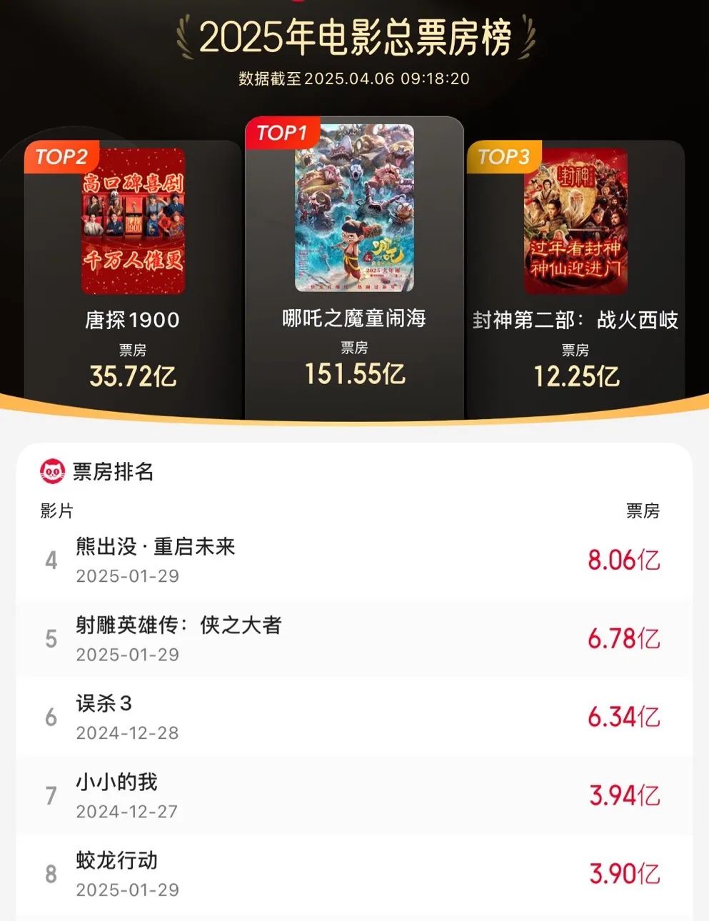 《哪吒2》的成功,似乎给电影市场打了一剂强心针。截至2025年4月6日,《哪吒2》的内地观影人次已达3.1亿!《哪吒2》把很多从来不去影院的观众吸引进来,成就了一个21世纪以来的中国电影奇迹。